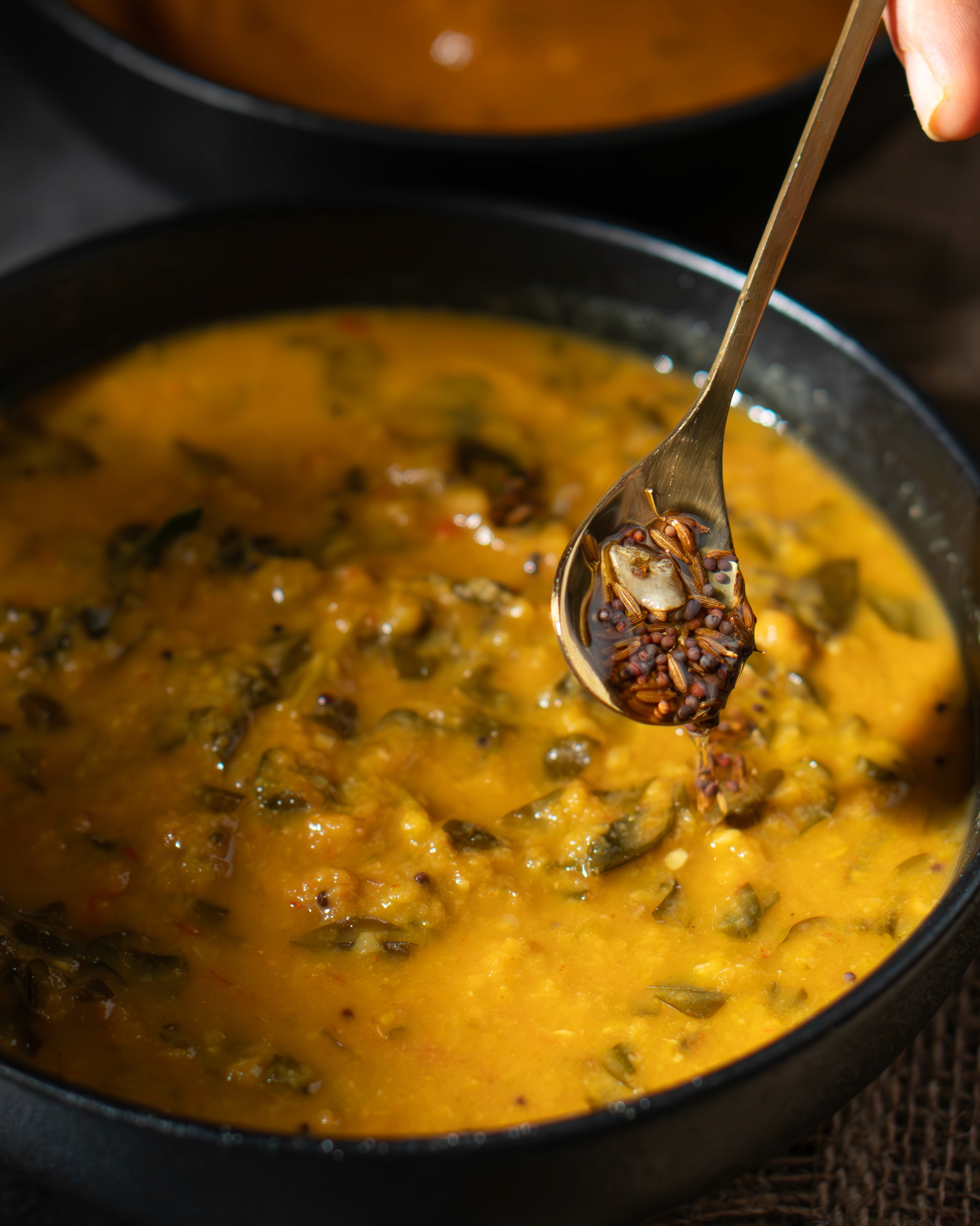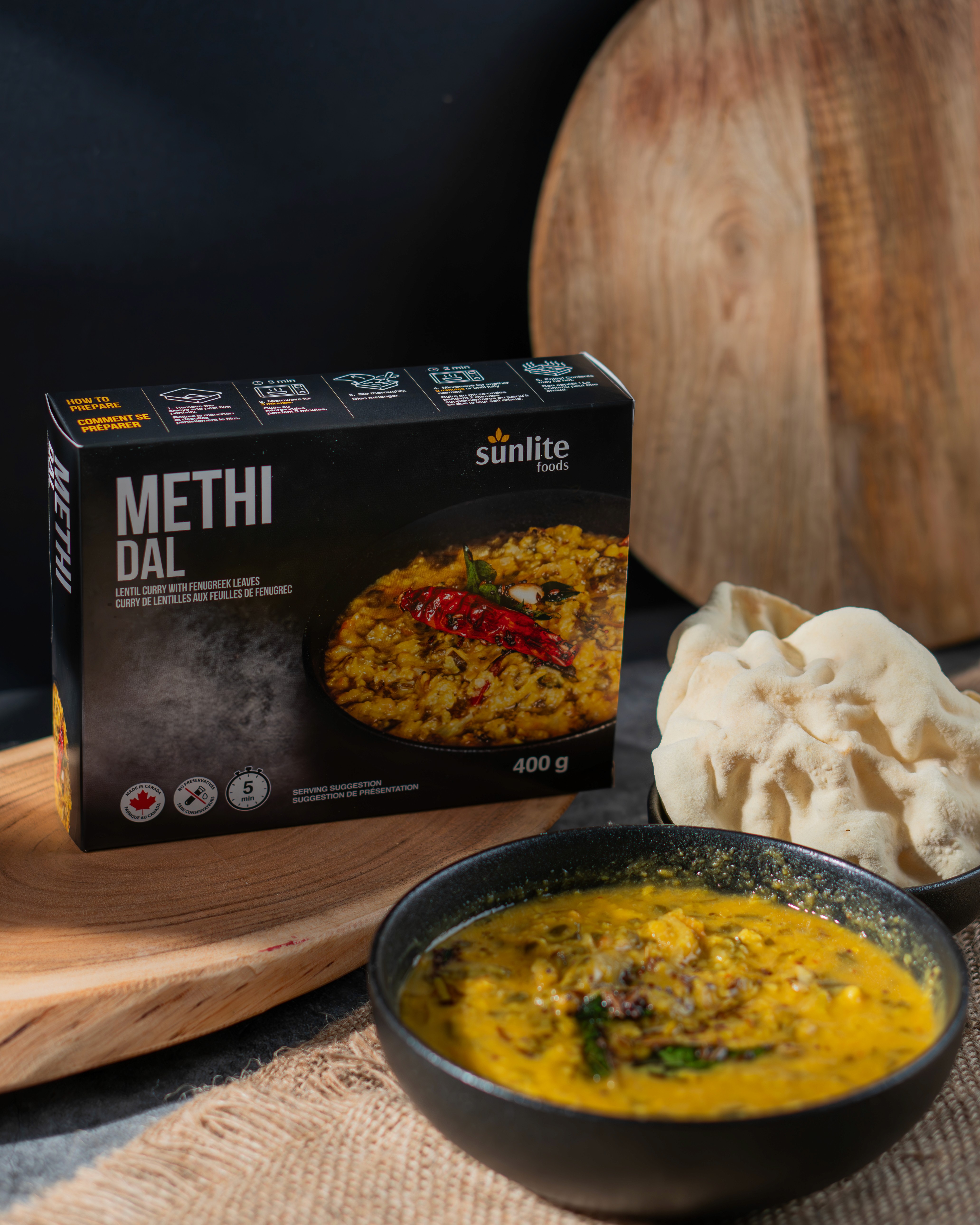 Nutty lentils simmered with fresh fenugreek leaves and spices.